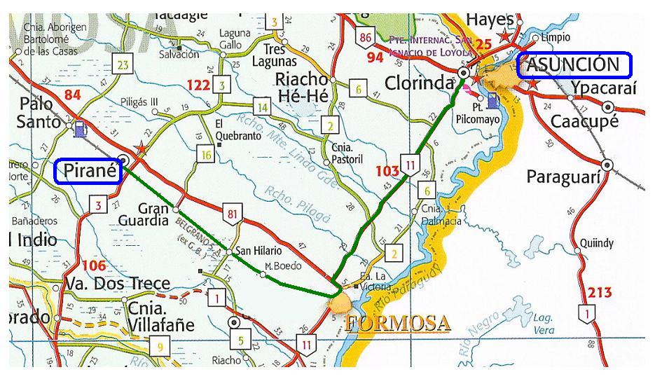 : x RUTA = Clorinda (*) y Cañada Doce, propiamente x vias ferreas = Puerto Formosa / Formosa (*) / Desvio