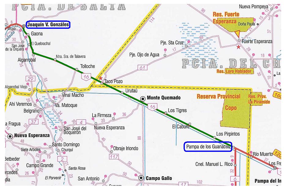 6 y desde Pampa de Los Guanacos hasta el destino lo hace paralelo a la Ruta Nacional nº 16,